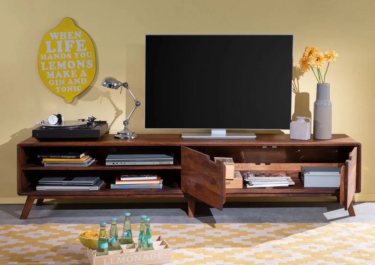 THE WOODEN CITY TV Cabinet (SIZE :- 134x40x48 cm) combines timeless elegance with practical functionality. Crafted from premium rosewood and finished with a light brown lacquer, this cabinet delivers sophisticated storage for your entertainment setup. The rich wood grain and smooth lacquered surface create a refined aesthetic that complements any interior décor. Designed with durability in mind, this piece offers reliable support for your television while providing concealed storage for media equipment and accessories. An investment in quality craftsmanship that enhances both your living space and viewing experience.