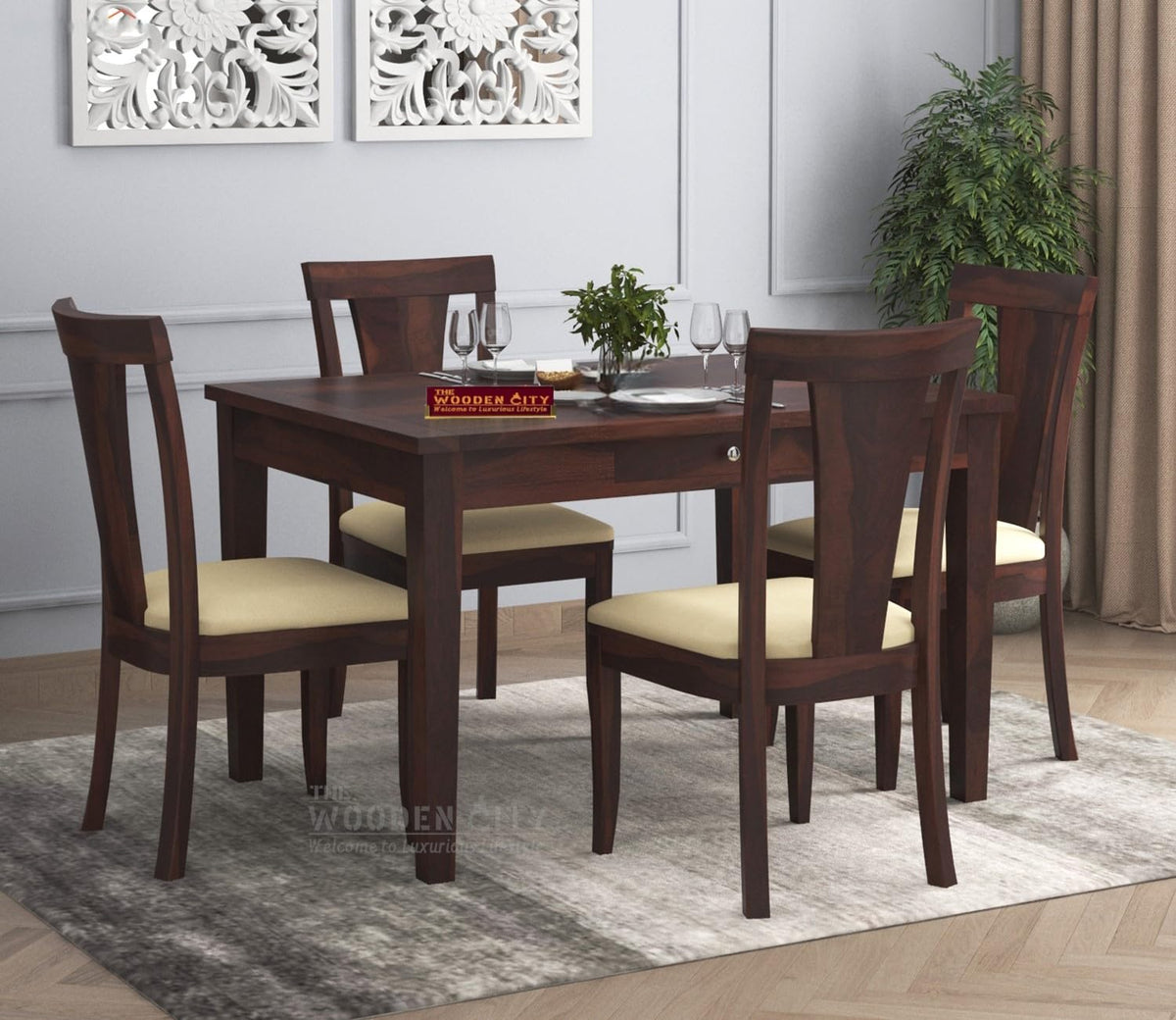 THE WOODEN CITY Solid Sheesham Wood 4 Seater Dining Set Dining Table Set with Cushioned Chairs and Drawer Storage for Dining Room | Living Room | Home & Office | Hotels Restaurant(Walnut)