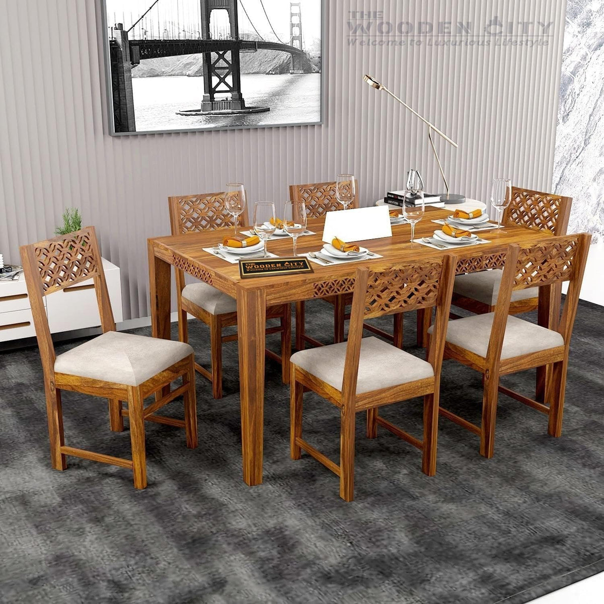 THE WOODEN CITY Sheesham Wood CNC 6 Seater Dining Table with Chairs | Wooden Six Seater Dining Room Set Dinner Table Furniture for Living Room Home Hotels - (Honey)
