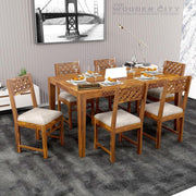 Crafted from premium Sheesham wood, this CNC-designed 6-seater dining set combines durability with refined aesthetics. The honey finish highlights the natural grain, offering a warm and inviting ambiance for your dining space. Engineered for both residential and hospitality use, the set includes a spacious table and six ergonomically designed chairs, ensuring comfort and style. Ideal for living rooms or dining areas, it balances functionality with timeless elegance.